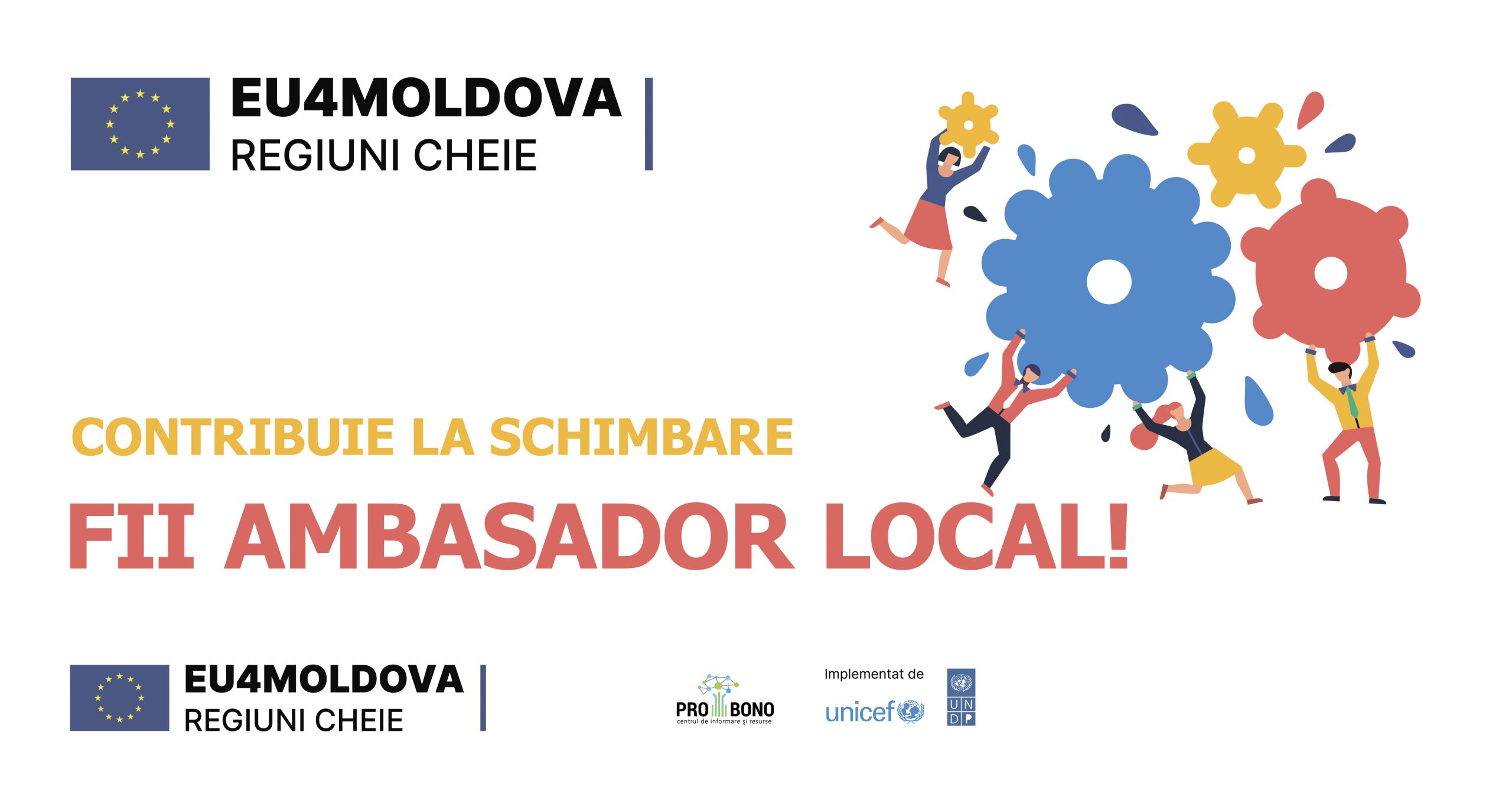 În cadrul proiectului „Dezvoltarea sectorului de tineret în regiunile Cahul și Ungheni prin elaborarea politicilor participative”, Centrul de Informare și Resurse PRO BONO (partener de implementare al UNICEF Moldova, selectează tineri dornici de a contribui la dezvoltarea sectorului de tineret și pentru a deveni Ambasadori Locali – promotori ai schimbării.